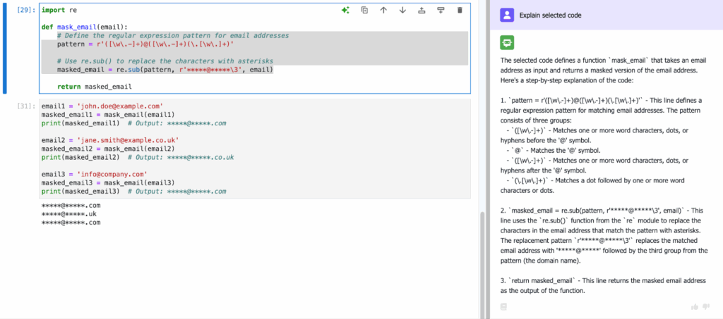 - Seamless integration within notebooks – Copy and execute generated code within a notebook cell with the click of a button.