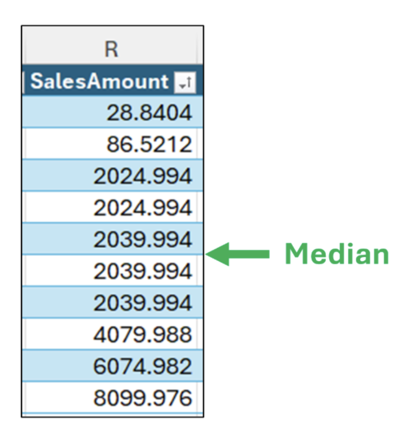 In these situations, the median is calculated as the average of the two values in the center of the sorted data. In this example, the two values are the same, so the median is $2,039.994.