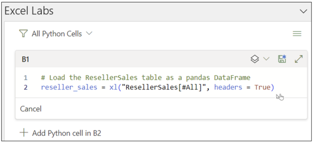 First, the following Python code loads the ResellerSales Excel table using the pandas library: