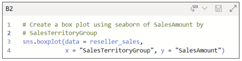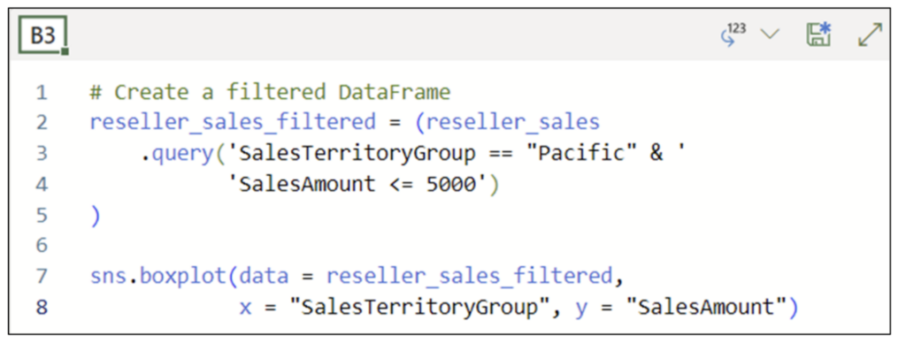 The following Python code filters the reseller_sales DataFrame and visualizes it as a box plot. Filtering makes for a simpler visualization: