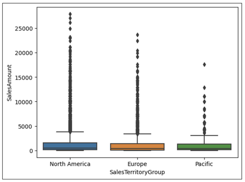Examining the box provides many insights regarding the distribution of SalesAmount for the Pacific SalesTerritoryGroup (Fig 13):