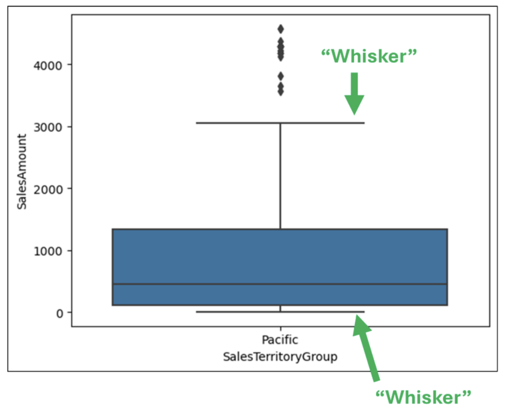 - The bottom whisker is very short, indicating that most low SalesAmounts range from $0 to approximately $100.