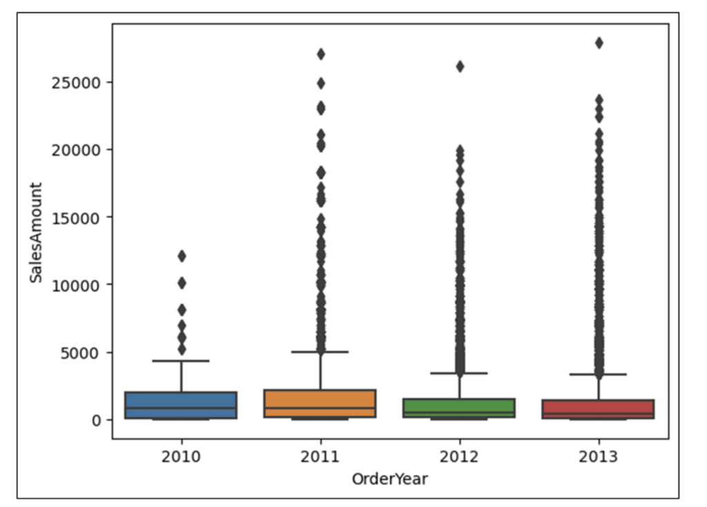 - The heights of the 2012/2013 boxes are shorter than those of the 2010/2011 boxes. This indicates that the distribution of SalesAmounts skewed smaller in later years.