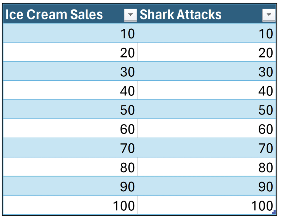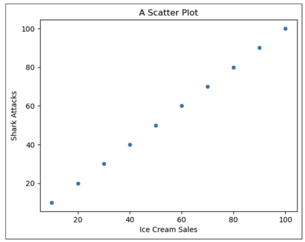 For example, Fig 07 shows perfect positive correlation between Ice Cream Sales and Shark Attacks. However, it is silly to assume that Ice Cream Sales cause Shark Attacks!