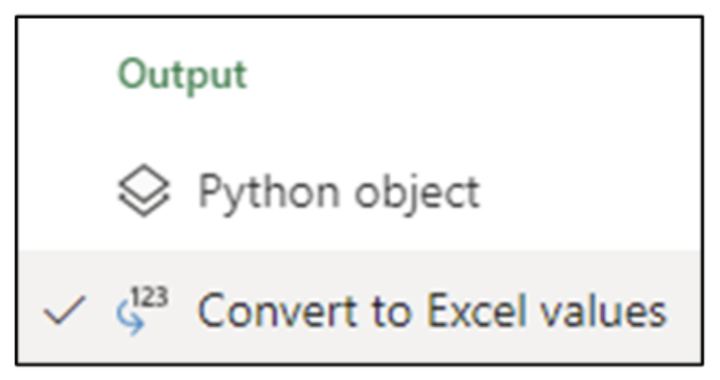 The Python Code Editor cell shown in Fig 16 is configured with the Convert to Excel values option. Executing the code produces the following visualization: