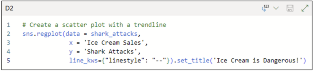 The code shown in Fig 06 is very similar to that in Fig 02. The notable difference is the use of the line_kws parameter to set the style of the trend line to be dashed.
