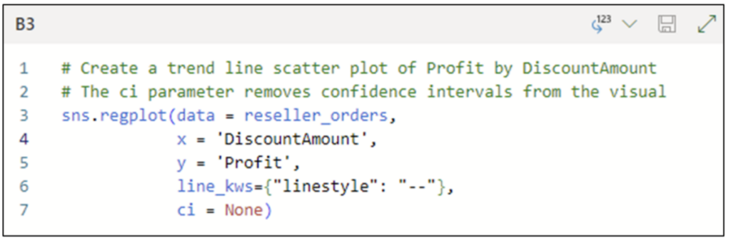The confidence intervals provide a visual indication regarding the level of error for the trend line model. The code in Fig 14 configures the scatter plot not to display the confidence intervals.