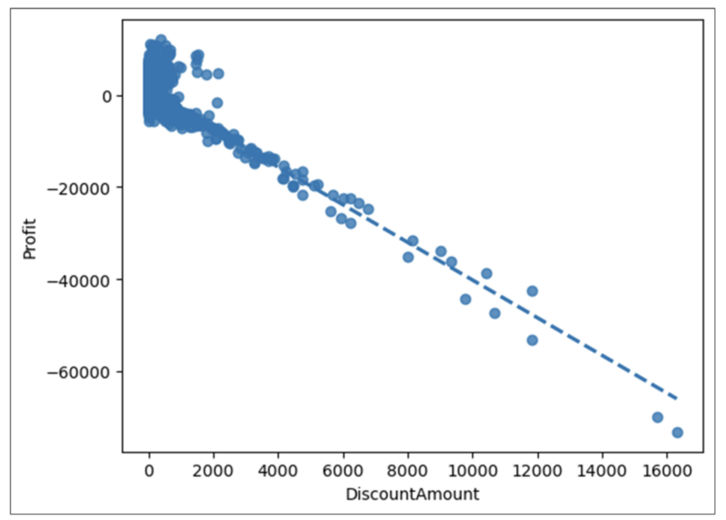 As discussed earlier, this correlation analysis shouldn’t assume that DiscountAmounts cause Profit. However, this highly predictive relationship is certainly worthy of further analysis.
